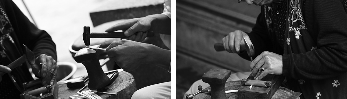 到后來隨著社會的發(fā)展,生活的改善,“小爐匠”們不再出門在外,就在家做一些當(dāng)?shù)厝吮容^喜愛的白族首飾。隨著寸家的精湛手工藝傳遍大家小戶,那時候在當(dāng)?shù)鼐秃苡忻麣?,大多都是定好了才做的,可是有些聞名而來的外地人把樣品都帶走了,還建議說開一個小銀鋪多做一些成品方便外地人的購買,后來就多做了一些成品,做了柜臺成了大理的第一個小銀鋪。就在這個時候寸家有了新的接班人,隨著就有了各種新穎的款式,吸引了更多顧客。對于寸四銀匠來說每一件銀器都是一件藝術(shù)品,都刻有寸家的標(biāo)志。對于大理白族人來說刻有寸四銀莊的標(biāo)志才是最好的銀首飾。慢慢的小銀鋪變成銀器店,隨著大理旅游業(yè)的發(fā)展,有很多的國內(nèi)外游客都被寸家銀器所吸引,他們帶走精雕細(xì)琢的銀器也留下了很多不錯的建議??恐再|(zhì)量求生存,以信譽(yù)求發(fā)展走到了今天,就是現(xiàn)在的寸四銀莊。寸家下一代不僅繼承了上一代的技藝精華,同時不斷吸取其他現(xiàn)代首飾和各民族的文化,制作出巧奪天工、獨具一格的銀飾。能工巧匠的寸家祖先們制作出了各種各樣的銀器。他們游走他鄉(xiāng),走一路“打”一路,那時候人們都叫他們“小爐匠”。